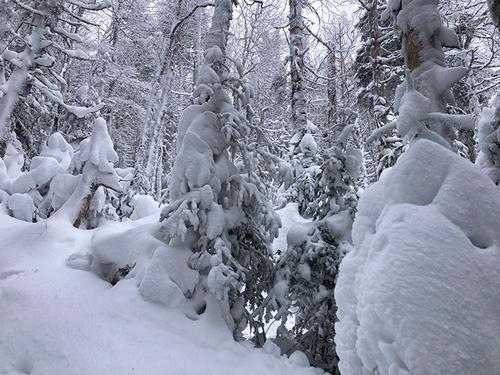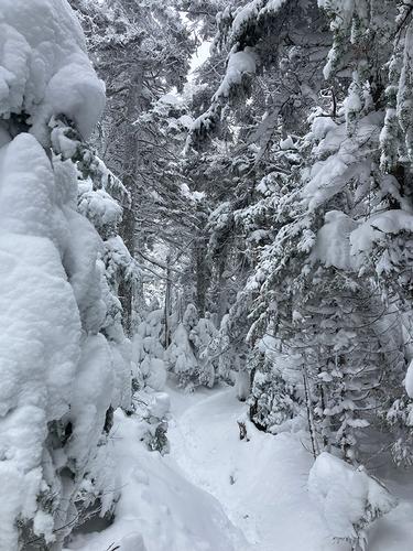 We struggled for a few minutes to confirm we were actually on the trail but eagle eye Alex found the path and took the lead breaking trail. The snow now was 2+ feet but we marshaled on towards the Mizpah hut. Unfortunately it wasn’t just snowdrifts, it was consistent deep and then deeper snow that got to be waist high. Even in second position following Alexander the snow depth made it exhausting. If we were a larger group we could have taken turns breaking trail, but since it was just the two of us, and we were not sure that Crawford path would even be broken, we decided to turn back after about 3/4 of a mile.