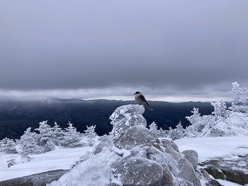 Although break at Mount Pierce to share nuts with the birds, and then headed back down the way we came. By now the trail was perfectly packed down and we made good time. We encountered probably another 15-20 folks coming or going up to Mr. Pierce. We didn’t finish the loop this winter, but it was a beautiful hiking day and we sure got a serious workout. And nice to be on the road home with a few hours of daylight left.
