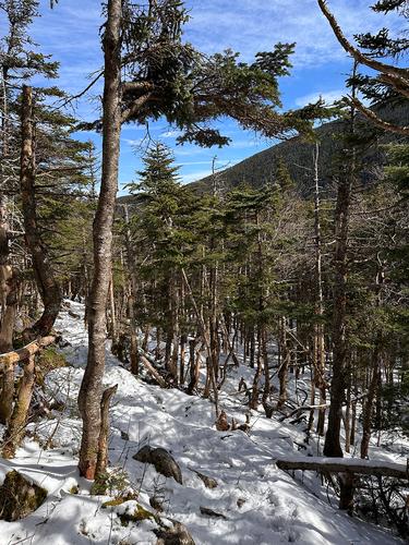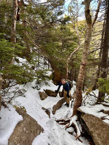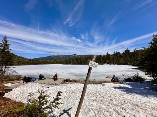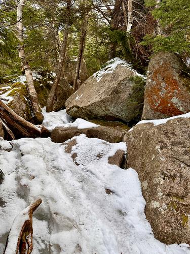 The LL parking area was essentially empty when I arrived and the trail was really quiet (nice!) in the morning, but more folks showed up as the day progressed, including dogs and kids, and some requisite eye candy which is always nice. Enough snow maybe ½ mile from the lake to put on spikes, but the monorails overall were easy to navigate. Some dramatic ice and rock navigation on the Kinsman trail for the final push to Cannon, but that only made. Stopped at the hut on Lonesome Lake for some lunch on the way back down. So pretty leisurely hike really, back down at 2:30.